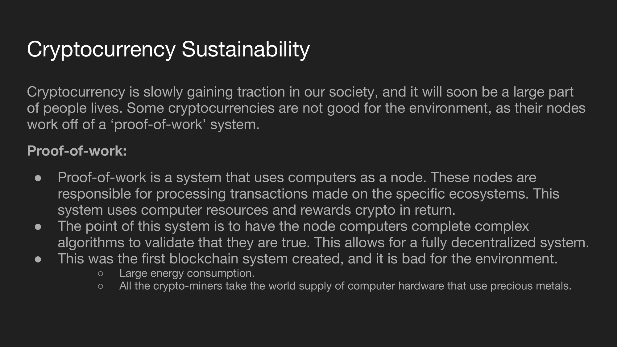 This project was very interesting to me. I enjoy the world of cryptocurrency. However, I previously only looked at the financial aspect of it. This project made me look at cryptocurrency in other scopes. In this circumstance, it was through the scope of sustainability, which was very cool to see and understand that everything must be looked at critically, and from different eyes.